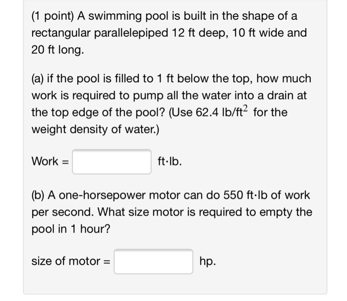 Solved 1 Point A Swimming Pool Is Built In The Shape Of Chegg Com from media.cheggcdn.com On a hot summer's day, it's hard to beat the feeling that comes with jumping into the cold, crisp waters of your you can inflate the top ring, fill the pool, and get swimming as soon as your water's balanced. Swimming pool care / pool maintenance. Surface area the surface area of a swimming pool can help determine the btu size of pool heaters.