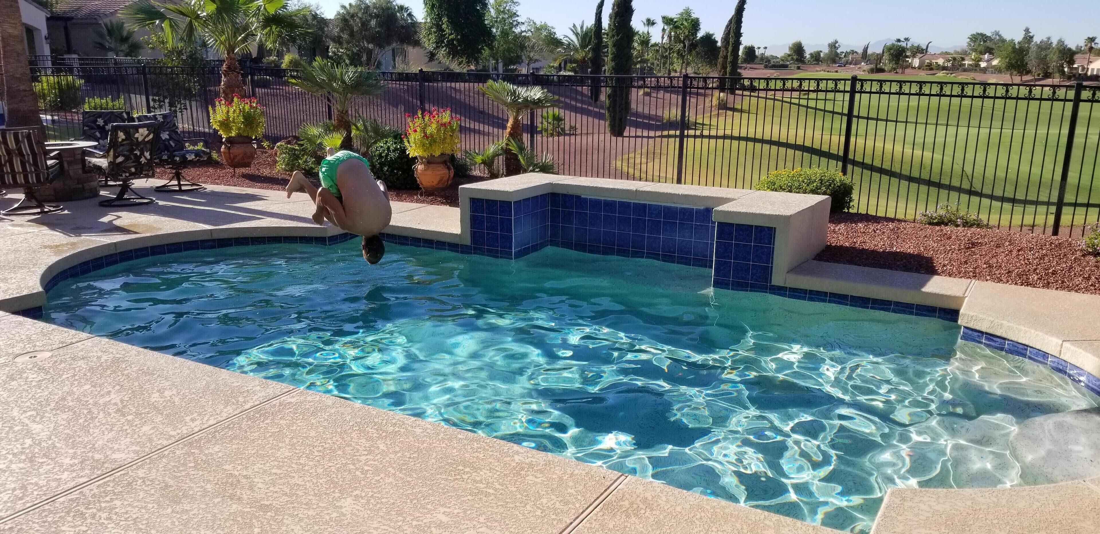 Swimming pool living room kitchen.